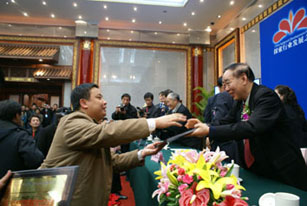圖為全國人大常委會常委楊興富為史丹利公司總經(jīng)理高進華頒發(fā)第二屆中國農(nóng)民喜愛的農(nóng)資獎牌